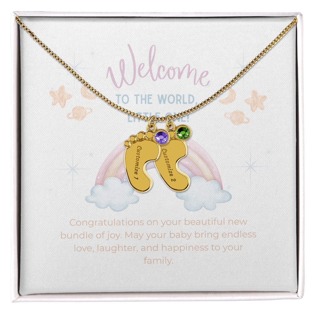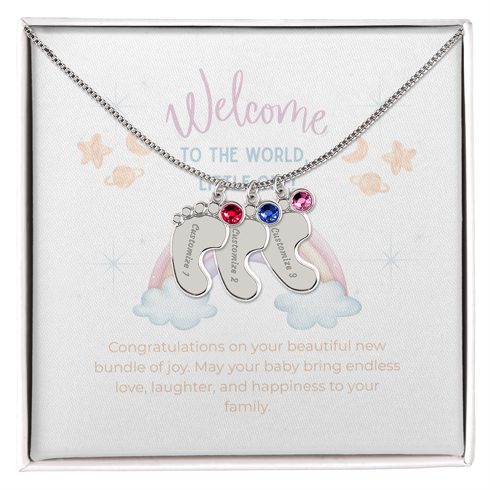 Celebrate the arrival of a newborn or cherish a precious memory with our Custom Baby Feet Necklace with Birthstone. Personalize your gift by engraving a name of your choice onto the pendant and choosing a crystal that correlates with the baby's birth month. And by picking multiple pendants, a custom present like this is perfect for moms and grandmothers with big families. This is a one-of-a-kind keepsake that will be treasured for a lifetime!